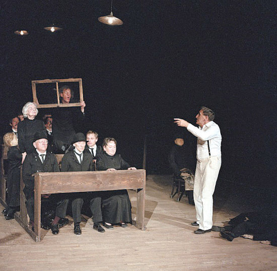 康多爾作為演出的“觀看者”出現在舞臺上,也是其獨到之處。他想通過“觀看”的一系列反應去引導觀眾與演員的交流,然而,他的在場,恰恰成為舞 臺上的“死亡物”與觀眾之間的另一層介質,他轉譯了歷史與過去之于今天的意義??刀酄柍錾臅r代,是一個政體動蕩、戰火漫天的時代,他血脈里的猶太民族精 神注定了他在這個時代的悲苦和絕不屈從。他的父親是一名波蘭軍官,長期征戰在外,沒有參與他的成長,后在二戰中慘死于奧斯維辛集中營。父親的缺席與民族的 被迫害使康多爾對死亡寄寓著追思與希望,他一生反抗主流、逆其道而行,反而成就了獨特的戲劇美學觀,終其一生探索戲劇的本質。
