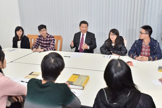 圖為:2014年12月20日下午,習近平來到澳門大學參與學生舉辦的 “中華傳統文化與當代青年”主題沙龍。