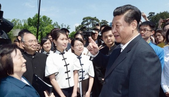圖為:2014年5月4日,習近平在北京大學觀看北大師生紀念五四運動95周年 青春詩會時同朗誦者親切交談。