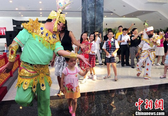 資料圖:國家級非物質文化遺產傣族孔雀舞傳承人旺臘、被人稱為“活孔雀”的國家級非物質文化遺產傣族孔雀舞傳承人約相等教榕臺小朋友跳世界非物質文化遺產“孔雀舞”。中新社發 張麗君 攝