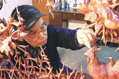 采訪中,王樹元拿起身邊的作品對記者介紹道:“傳統的津派木雕,先要構思設計,然后選取合適的材料,經過修光、細飾等步驟,采用淺浮雕、深浮雕、圓木浮雕等多種技巧進行雕刻,一件作品最多要花上幾年的時間進行構思?!?/p>