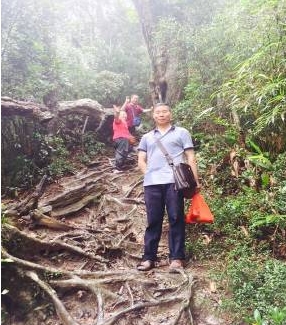 最初文友們三五成群輕松地走著,邊走邊欣賞路旁的鳳凰花和龍花,并在國家雨淋的石碑下合影,每個人的臉上都是燦爛的微笑,也就沒有對攀爬五指山的畏瑟。只有薛梅顯出了為難之情,說自己的膝蓋上有積液,擔心下山時行走困難,但她還是跟著大部隊前行,不到萬不得已的時候不能掉隊。而這里距五指山主峰3999M。