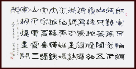 劉平,1931年11月生,江蘇省蘇州人,五歲隨父學書,臨池十年。1947年7月參加革命,1948年7月入黨,在部隊曾榮獲“解放獎章”“淮海戰役”“渡江戰役”紀念章等。1979年轉業回蘇州擔任學校(大專)黨政領導并兼課(職稱大學講師)。1992年離休后,曾在全國各類大展賽中獲各種獎勵一百多次。2000年曾代表蘇州市參加全國“夕陽紅書畫現場創作大賽”(全國文聯在杭州舉辦)獲金杯獎。2005年被江蘇省國畫院書法研究院聘為“特聘書法家”;2007年被聘為“中國名人書法家協會院士”;評為“中國書畫家協會(香港)一級美術師”;2008年聘為“世界文化藝術研究中心理事”等;并相繼被聘為“宋莊國際書畫院終身院長”“中國文化學會藝術委員會主席”,且被聘為英國皇家藝術研究院榮譽院士、客座教授等十多個榮譽職務。并榮獲“愛國愛軍優秀藝術家”“世界和平藝術家”“2001年——2010年中國百位金典藝術家”“推動中國社會進步突出貢獻人物”“感動中國文化人物”“和諧社會建設突出貢獻人物”當選為“二十一世紀全球華人最具影響力藝術家”先進事跡被載入《共和國功勛人物志》全國德藝雙馨勞動英雄等,并榮獲蘇州市“優秀老干部黨員”“四好老干部”等榮譽稱號。2014年又榮獲“國際金馬藝術獎終身成就獎”。2015年獲得中華文化突出貢獻獎、聯合國文化傳播大使、光榮入選、非物質文化遺產傳承人物。出版的作品集有個人選集《大家名家》雙人集有《當代藝神》《中印藝術大家》,合集有《書壇巨擘》《一代翹楚》《書畫藝術泰斗》《中國輝煌》《中華文化藝術巨匠》《日出東方》《文化強國》《盛世翰墨名家經典》(國禮卷)等。