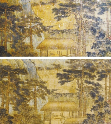 沈周《擬趙松雪萬木奇峰圖》 (局部)修復前后對比圖