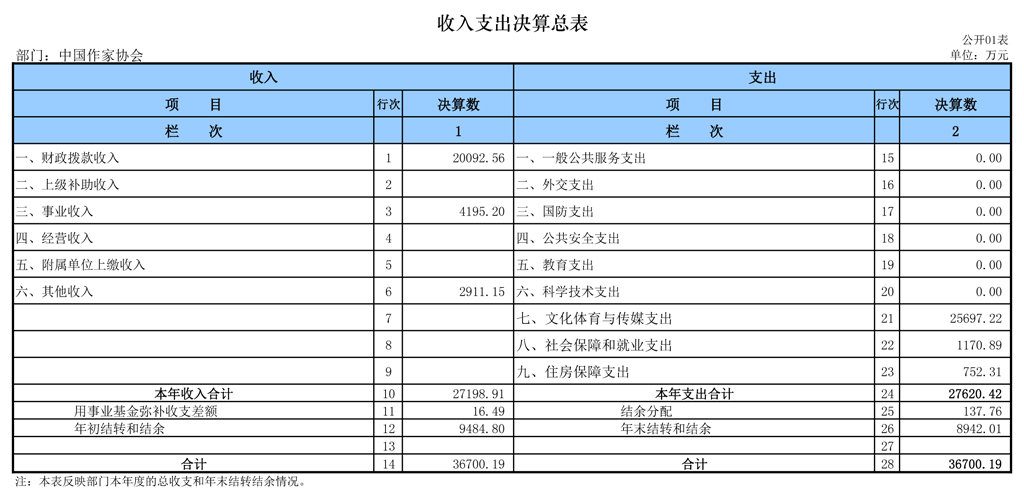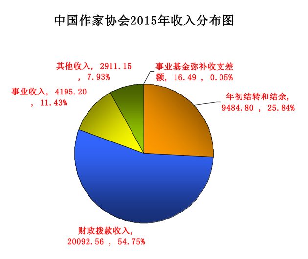 中國作協2015年度總收入合計36700.19萬元,總支出合計36700.19萬元。與2014年相比,收、支總合計各增加3256.69萬元,同比增長9.74%,增長的主要原因是財政撥款收入和事業收入增長。