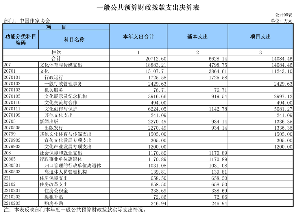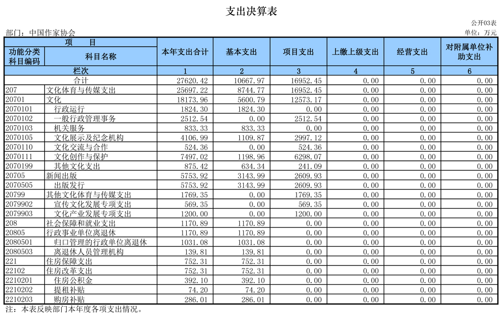 七、文化體育與傳媒(類)文化(款)行政運行(項):指中國作協本級行政人員工資及機構正常運轉、履行職責所需的基本支出。