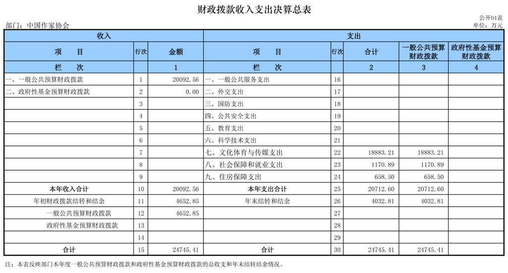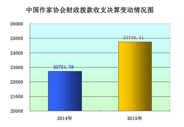 中國作協2015年財政撥款收支總決算24745.41萬元。相比2014年財政撥款收、支合計各增加2023.63萬元,增幅8.91%。主要原因是2015年因調資和養老保險改革導致人員支出增加。