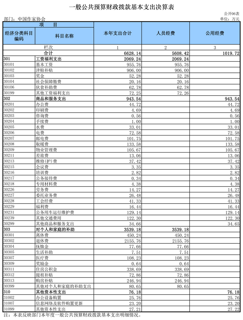 中國作協2015年度財政撥款基本支出6628.14萬元,其中: