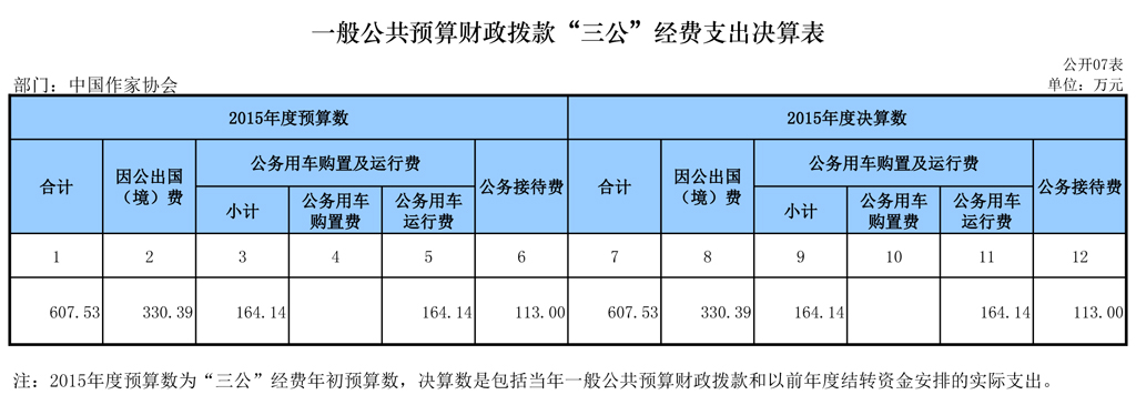 中國作家協會2015年財政撥款“三公”經費支出預算為607.53萬元,其中:因公出國(境)費330.39萬元,公務用車運行費164.14萬元,公務接待費113萬元。