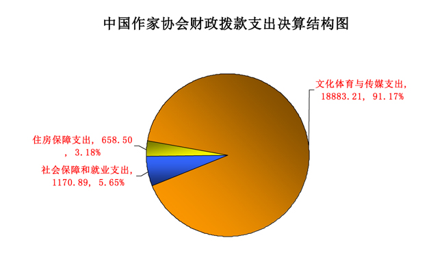 中國作協財政撥款支出主要用于以下方面:文化體育與傳媒支出18883.21萬元,占財政撥款支出的91.17%;社會保障和就業支出1170.89萬元,占財政撥款支出的5.65%;住房保障支出658.50萬元,占財政撥款支出的3.18%。