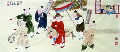 “擇婿”喚作“捉婿”,動感立馬增強,戲謔之情油然而生。那些為功名所累的學子們,“十年寒窗無人問,一舉成名天下知”。于是乎,聞名而來求婚的人擠破了柴門。不管你是富家子還是窮酸儒,也不管你是少年郎還是老學究,只要是文曲星下凡,就不愁如花美眷送上門。話說福建有位叫韓南老的人,古稀之年進士及第,鄉里人都想與他攀親結貴。欲釣“金龜婿”的富戶,便托媒妁登門求親。韓南老覺得可笑,遂以打油詩作復:讀盡文書一百擔,老來方著一青衫。媒人卻問我年紀,四十年前三十三。如果說這是齊東野語、坊間傳聞,不足為信,那么下邊這段軼事,卻是見諸堂堂正史。