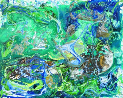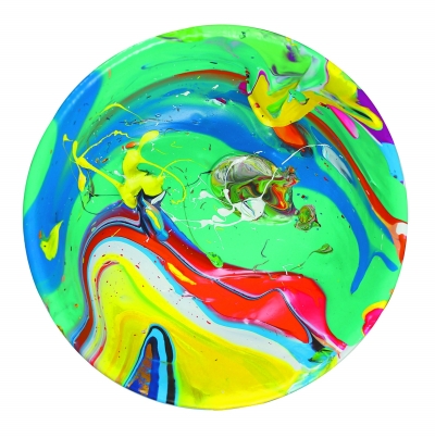 西方興起的抽象藝術與中國意象文化具有異曲同工之理,兩者都在思維方式上講究以直覺的感性來把握經驗的理性,不拘泥一時一地的形象再現,以“意”為“象”,以“意”造“象”,既非被動的客觀敘事,也非完全主觀臆造。介于“似與不似之間”,其美學特征表現為象征性、含蓄性和神秘性。北宋郭熙在《林泉高致》中說“畫者當以此意造,而鑒者又當以此意窮之”。在顧林的彩墨荷塘系列中,有的作品讓人感受著月光下荷塘清靜、素雅而又柔美,仿佛作者從水中荷葉下羞澀地窺視清澈的明月,襯托著荷花無聲的高潔。有的作品則反之,使人心悸,美好的生命或環境遭遇不堪的涂抹和踐踏。還有碗狀系列,是作者意象表現的出人意料、出神入化之筆。顧林把調色碗中剩余的掛彩進行表達,完成一種以碗為畫的抽象圖景,在形式上足以標新立異。你可以把碗狀系列窮之為人類對地球的改變,也可以把碗狀系列窮之為社會、窮之為人生,不同的價值、境遇窮之不同、感悟之不同,這就是意象和抽象文化帶給人們的藝術浮橋。