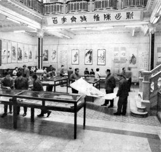 1959年之前的南京東路422號,原是老九莊綢布店,建筑風格中西合璧,天井式結構,二層有回廊。成為朵云軒之后,氣象一新:營業大廳寬敞氣派,正中高懸著“百花齊放,推陳出新”八個大字,底下陳列著書畫、文具,甚至還擺出一套紅木臺椅,招待四方來客。