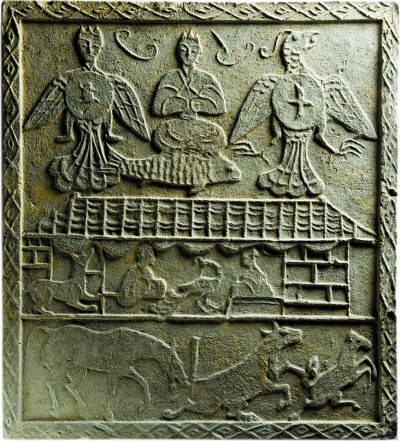伏羲、女媧形象在漢代畫像磚里出現最多。在中國古代神話里,伏羲、女媧是人類的始祖,二者位列三皇。傳說伏羲創八卦、結繩造字,女媧煉石補天、捏黃土造人。他們成婚繁衍了人類,被譽為中華民族的“人祖”。女媧是有司生育繁子神力的女神,伏羲“制嫁娶”,亦含有司婚姻的意義?!胺伺畫z雙龍樓闕”畫像磚分上下兩部分,上為一座雙闕式建筑,左有一執笏官員,躬身迎接,闕內一人跪拜;右為伏羲女媧二神,其尾相繞,后延至磚的下部,呈一對巨龍,構圖巧妙。此圖應是虔誠婦人在官祠里向二神禱告,祈求幸福的婚嫁和綿長的子嗣。整個畫面渾然一體,充滿神秘,含義頗深。