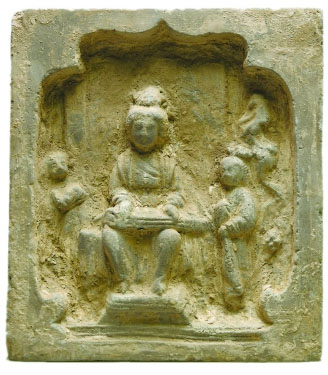 西王母也經常出現在漢代畫像磚中。西王母原是居于昆侖山上掌控著不死之藥的至高神,自漢武帝將求仙活動轉向西方以后,昆侖與西王母的信仰便漸漸融合在一起。至東漢時期已經形成了一個以昆侖、西王母、天門為中心的西方升仙信仰。而西王母也漸漸演化為后世道教中掌管仙籍的神祇。登上昆侖、拜見西王母、進入天門成為升天成仙的關鍵。這三層“獸-人-神”組圖畫像磚充分體現了漢朝人的生命價值觀。最底層的斗牛是原始生命力的迸發。進階到第二層的廳堂對晤是生而為人的思考與意趣,禽鳥居中起舞,犬于堂下守護欲入,人與自然渾然一體,和諧共處。而占畫像主體的則是日月神共侍西王母,這也與漢朝人的向死而生的生死觀是一致的。死亡不是結束,而是另一種追尋永恒生命與幸福的途徑。