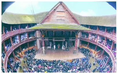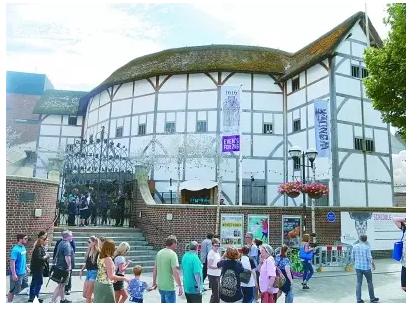 位于倫敦泰晤士河畔的莎士比亞環球劇院是一座專為欣賞、研究莎士比亞及其同時代優秀劇作家作品的劇場,是在17世紀劇院原址附近重建的,并恢復了原劇院的風格原貌。劇院為露天設計,觀眾可以站在舞臺前觀賞。