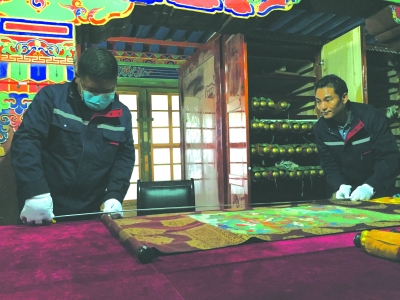 在布達拉宮,普查工作人員正在測量一幅唐卡的長度。