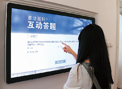 “當事人及其訴訟代理人因客觀原因不能自行收集的證據,或者人民法院認為審理案件需要的證據,人民法院( )調查收集?!崩ㄌ柪镞x項有“可以”“應當”“應當委托律師”。在人機知識問答平臺區域,筆者看到,林女士正認真地答著題,一番思考后,她在答題屏幕上按下了“應當”這個選項。隨即屏幕上便彈出:“恭喜您答對8道題,獲得普法達人稱號?!薄耙还?0題,對了8道,我還是很開心的?!绷峙颗d奮地說,“我覺得這個互動答題的板塊特別好,這種知識問答的形式能讓人們在游戲中學習法律知識?!?/p>