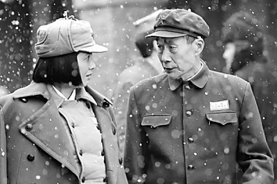 電影開演,銀幕上是黑白色調,茫茫風雪中,一些被動員來支疆的女戰士因不滿上級介紹對象,紛紛帶著情緒要離去。這時,一輛軍用吉普車駛來,甘祖昌出現了。他不是來阻止、批評她們的,而是來送送這些女戰士,他說,無論去留,你們都是建設祖國的好青年!一組簡短的鏡頭,演員李雪健就把一位經歷過二萬五千里長征,一身英氣、可親、可敬的形象,定格在銀幕上。陶慧敏飾演的龔全珍——那個有著一雙純情、羞澀、美麗的大眼睛的女孩也在場,這是她初識“甘部長”。隨后,影片跟從故事的發展,由黑白片轉為彩色片,于細節處展現甘祖昌和龔全珍這對革命伉儷扎根家鄉、建設家鄉的時代語境,其中既有對甘將軍艱苦奮斗的現實主義刻畫,也有對龔全珍一生相隨、大愛無私的浪漫描繪。