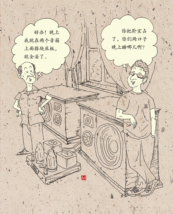 “好辦!晚上我就在兩個音箱上面搭塊床板,就全妥了,跟你說吧,晚上睡在音箱上,心里倍兒滿足?!?/p>