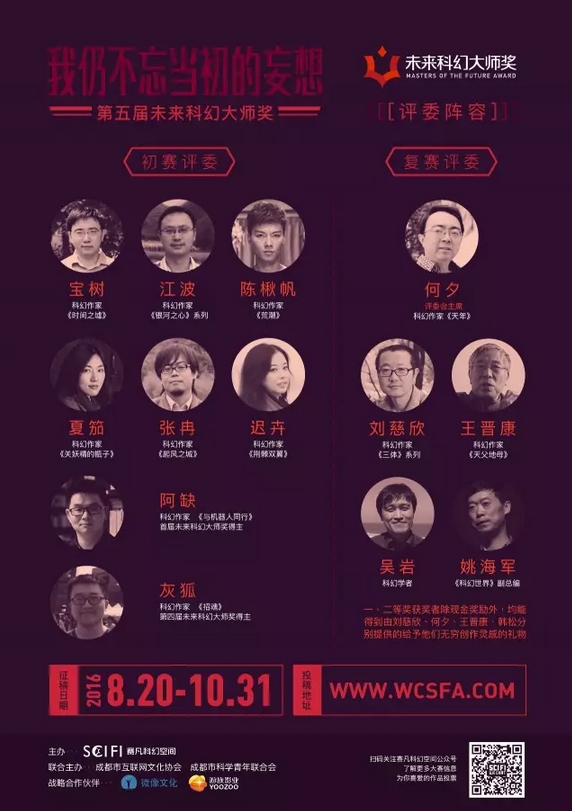 經過4年的發展,“未來科幻大師獎”累積投稿量近千篇,同時涌現出阿缺、灰狐、胡紹晏、念語等一批活躍在科幻文學創作一線的科幻作家,其中歷屆征文比賽中的部分獲獎作品也正在影視轉化的制作過程中。2016賽凡科幻空間攜手成都市互聯網文化協會、成都市科學青年聯合會正式啟動第五屆“未來科幻大師獎”,我們熱誠期待您的參與。