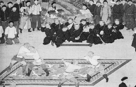 到清代,角抵開始與滿族民俗相交融,并被稱為“布庫”。由于宮廷支持,這項運動又逐漸走向新高潮?!吧茡錉I”稱為當時清廷專門管理角抵的機構,同時也出現了專職的“布庫手”,其單以角抵為職,研究和練習摔跤。這在清代畫家郎世寧創作的《塞宴四事圖》中即有描繪。每年臘月二十三日,其會在養心殿前舉行比賽。按畫中所示,參與比賽的四人兩兩對抗,氣氛緊張。