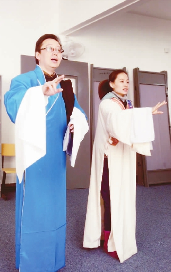 賀紹倫(左)在上海戲劇學院進修時與同學學習戲曲知識