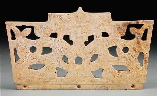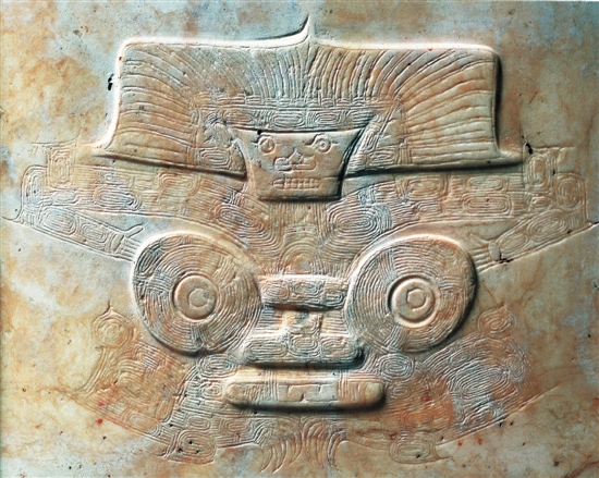 1986年浙江省杭州市余杭區瓶窯鎮反山遺址M15出土 玉冠狀器為良渚文化時期帶有禮儀性質的裝飾玉器。該器物平面整體呈寶蓋頭結構,如同良渚文化晚期的臺階形玉片的結構,冠頂中部切割呈寶蓋頭結構,下端扁榫上有三個等距的對鉆小孔。正反兩面以透雕和陰線刻劃相結合的技法,對稱雕琢肢體俱全的神人圖像,填刻光芒線的寶蓋頭冠帽,倒梯形臉部,單圈眼,一側刻劃眼角,刻劃有牙齒的寬嘴。神人上臂兩側各“持”有鳥形象,此部位紋飾或可視為獸面紋的雙眼,神人胸腹部位為一般常見的圓拱形結構。兩面的紋飾除個別刻劃線條的結構有區別外,余均一致。