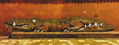 齊興華利用破損墻面的走勢畫了條鱷魚,不久即被破壞,依舊露出丑陋的墻面。