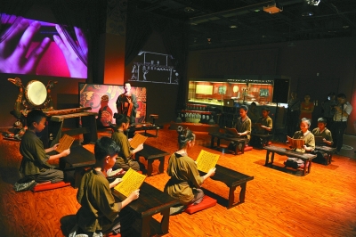 楚人尚紅,故本次展覽展廳的主色調以紅色為主,展墻上暗紅與鮮紅交錯,層次分明,醒目異常。在展廳中央,還專門為觀眾特意搭建起一個楚國宴樂復原場景展示與社教活動相結合的公共空間——“楚風體驗堂”。觀眾耳熟能詳的楚國傳統樂器的復制品,如青銅編鐘、虎座鳥架鼓與楚瑟都被放置在“楚風體驗堂”中展示,并配以編鐘演奏和宴飲圖動畫。觀眾在此可對楚人的生活有更直觀的體驗。