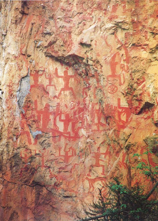 南方高地涂繪型巖畫,主要包括廣西、云南、貴州和四川等省區的巖畫。這類巖畫一般具有以下幾個特征:1.巖畫大都分布在崇山峻嶺、河谷沿岸的懸崖峭壁。巖畫分布相對集中,畫面巨大,圖像密集。這些地方人跡罕至。沒有特殊的原因和狂熱的激情,不可能在這些偏僻的地點完成如此艱巨的工程。2.巖畫采用涂繪的方法制作。顏料用牛血攪拌赤鐵礦粉末而成,繪制工具有毛刷、獸尾和人的手指等。3.巖畫的圖像以人物為主,動物次之。圖中人物有的頭插羽毛,有的身飾獸尾,造型有諸如雙手上舉、雙足分立等特殊姿勢。畫面經常出現長尾猴、短尾猴、水牛、銅鼓和干欄式建筑等古代西南地區的特有景物。4.巖畫的時代上至新石器時代晚期,下到公元2世紀左右。