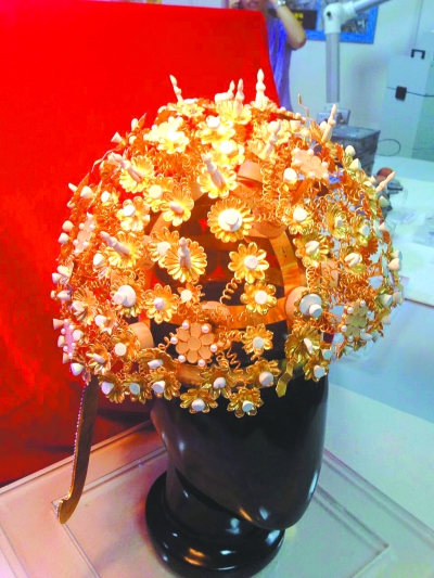 “由于墓葬填土的機械性擠壓,蕭后冠出土時已經傾斜、坍塌、變形。冠飾上的絲織品已糜爛,絕大部分花托破裂,花蕊嚴重風化,一些飾件間還有粘連現象?!比涨?,記者從陜西省文物保護研究院與揚州市文物考古研究所聯合舉行的新聞發布會上獲悉,由于出土時保存狀況極差,蕭后冠已不可能完全復原。但經專家研究后發現,目前已知的蕭后冠上包含的材料和工藝多達十幾種,復雜、精美程度超乎想象,根據研究成果仿制的蕭后冠也將于近日在揚州博物館展出。