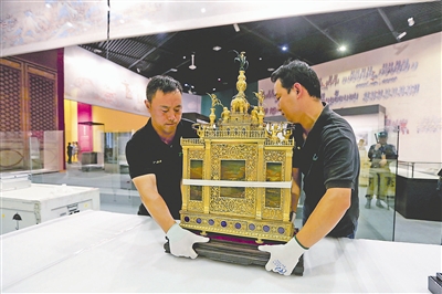 記者注意到,裝文物的木箱一打開,里面除了泡沫填充防震以外,還專門有結實的木條綁定關鍵部位,防止文物在箱體內晃動。木條本身也進行了布條或泡沫纏繞,以免刮碰傷及文物。開箱布展工作按照先置放大型的、具有獨立展柜的文物開始,比如鐘表、盒、座椅之類的重器。為了展陳效果,一些黑色的底部展布需要從雙層玻璃包裹的展柜里取出進行除塵處理,幾個工作人員特別用手持小型吸塵器精細地做著此項工作。