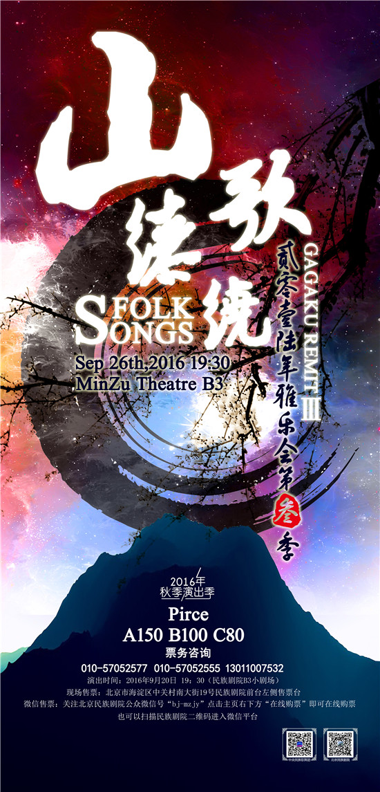 9月26日,《山歌繚繞——2016雅樂匯第三季》將在民族劇院B3小劇場上演。山歌是指人們在田野勞動或抒發情感時即興演唱的歌曲,其內容廣泛、結構短小、曲調爽朗、情感質樸、節奏自由 。山歌主要集中分布在高原、內地、山鄉、漁村及少數民族地區,流傳極廣,是中國民歌的基本體裁之一。9月26日,一場“山歌”的音樂大餐將在民族劇院B3小劇場上演。