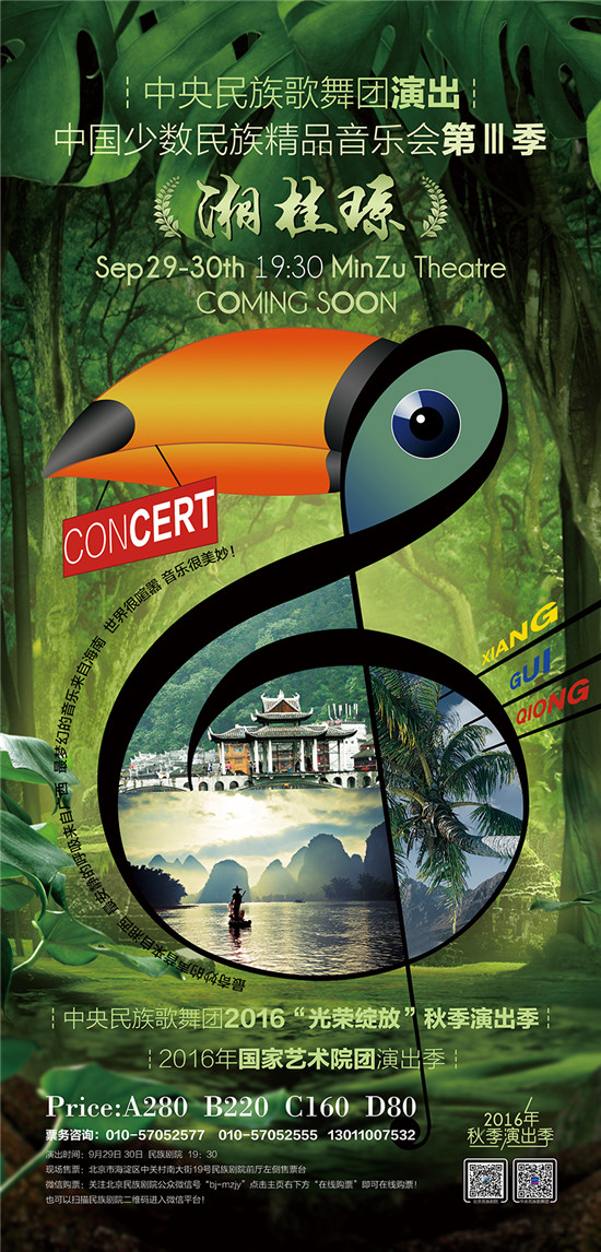 國慶來臨之前,中央民族歌舞團的藝術家將以今年春季去湖南、海南、廣西采集到的多民族音樂素材而創作的一臺音樂會《湘桂瓊》獻給祖國。這臺音樂會集苗、土家、黎、瑤、壯、京等少數民族音樂,既有各民族自己獨特的音樂符號,又有民族之間交融而產生的“中華民族一家親”共生藝術感覺。音樂會將有一部分原生態藝術家帶來首都觀眾很少看到的鼻簫、打叮咚、打溜子、咚咚奎等特有的少數民族音樂節目,更有生靈活現的“猴鼓”等精彩表演。