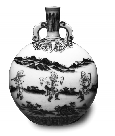 元朝藝術的一個招牌性的成就,是著名的元青花,但是臺北故宮沒有,因為元青花發現的很晚,要到20世紀50年代才有人開始研究,所以以前沒有人知道,清宮里也沒收藏。但是臺北故宮有很好的明青花,特別是早期的永宣青花,就是永樂宣德兩朝的青花。這次特展展出了一個永樂時期的“青花西域舞樂人物紋扁壺”,上面除了傳統的山水園景之外,還有五個西域人在奏樂跳舞,這是明早期青花里很罕見的主題,而且反映了當時絲綢之路交流的情況,價值極高。