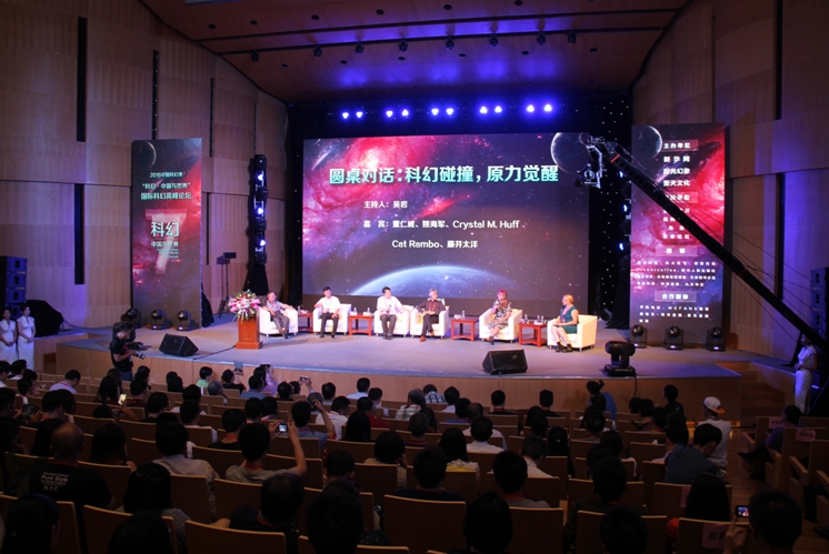 在這次高峰論壇的第一單元:“世界科幻之巔”中,華語科幻星云獎創始人作為中國代表與美國科幻奇幻作家協會主席凱特?蘭博分別作了主題發言。中國、美國、日本的星云獎主席會長與世界科幻大會雨果獎聯合主席開展了圓桌對話。