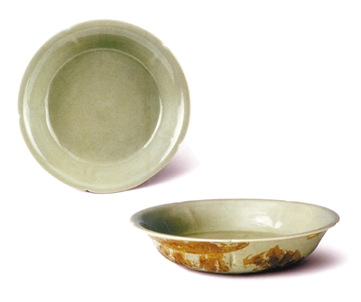 “秘色瓷”一詞最早出現在晚唐詩歌中。唐陸龜蒙對其有“九秋風露越窯開,奪得千峰翠色來”之詠。前蜀開國皇帝王建在給后梁開國皇帝朱溫的致謝信中稱贊對方信物中的越窯秘色瓷器“秘色抱青瓷之響”……這些詩情畫意的描述勾起后人對秘色越器的種種遐想和神往。宋代關于秘色瓷為“供奉之物,不得臣庶用之,故云秘色”的說法更為其平添了幾分神秘色彩。北宋以后,“秘色瓷”消失得無影無蹤,在此后很長一段時間里人們對它的理解也莫衷一是。明清文獻如《格古要論》《長物志》和《飲流齋說瓷》等,對越窯的描述僅僅是轉述傳聞而已。直到上世紀八十年代,隨著陜西法門寺真身寶塔西半部轟然倒塌,十三件“秘色瓷”得以告別漫長的幽居歲月,重見天日,方解開了“秘色瓷”的千古之謎?,F今在中國國家博物館展出的一件法門寺地宮出土的“唐代越窯五瓣葵口秘色瓷盤”(見圖),便一展“秘色瓷”的風采——造型圓潤飽滿,像一朵盛開的蓮花;釉色碧綠澄澈,如一泓盈盈秋水。