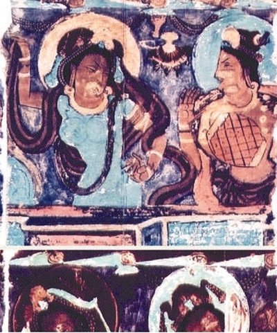 克孜爾石窟第八窟前壁壁畫中彈奏五弦琵琶的伎樂天人