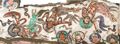 龜茲壁畫中的樂舞場面出現之多、規模之大、內容之獨特和豐富,是其他地區所罕見的。特別是其中出現的大量樂舞場面,很多在印度本土佛經中并沒有記載,但是在由龜茲高僧鳩摩羅什翻譯的許多佛經中卻有生動的描繪。如他翻譯的《妙法蓮華經·法師品》列了十種供養,其中第九種為伎樂,這是他譯作的獨特之處。此外,在《法華經·方便品》中,他談到“若使人作樂,擊鼓吹角貝,簫笛琴箜篌,琵琶鐃銅鈸,如是眾妙音,盡持以供養”,其中的樂器,都在龜茲壁畫中有所表現。這種情況,其實是古龜茲本土發達的樂舞藝術對佛教藝術影響的結果。
