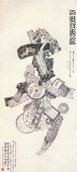 與唐英的手段不同,這是一種純粹的藝術創作。清道光十二年,六舟精心制作了一幅拓片。四年以后,他用這幅拓片賀贈借庵和尚82歲壽誕。圖中一個巨大的“壽”字用了三十多件或完整或破碎的古物拓片拼合而成,包括碑志、瓦當、錢幣、磚文等等,除了少數體量較小的錢幣可見其全形,大部分殘磚斷瓦上的文字零落不成章句。這些可辨而不可讀的文字,使得歷史既親切又遙遠。近處看時,這些彼此互不相關的文字碎片,好像隨意散亂地疊壓在一起,顛倒陸離,漫無用心;遠觀方知它們經過了作者苦心的經營,碎片的墨色濃淡不一,構成了“壽”字張弛有度的結構和用筆。