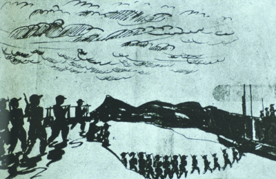長征路上,黃鎮先后畫了四五百張畫,但由于行軍打仗、風餐露宿,最后只保留下24張。在這些畫中,最有代表性的是《二萬五千里長征圖》,這是一張全景式濃縮的寫意畫,只用簡單的構圖就在尺幅之間完整形象地描繪出長征的漫漫征途,曾于1938年被單獨刊登在《新華日報》,流傳全國。