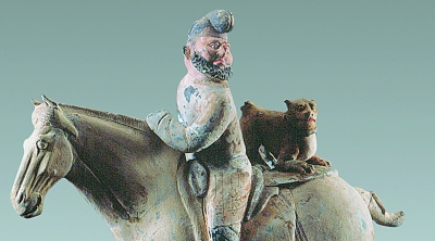 ●唐·彩繪陶騎馬帶豹狩獵胡俑