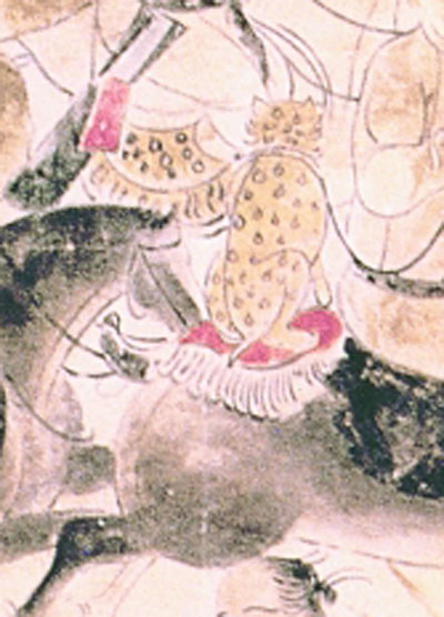 ②唐代章懷太子墓壁畫,唐昌東摹本。畫面中部獵手馬后坐一獵豹。圖片由作者提供