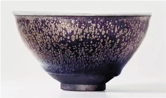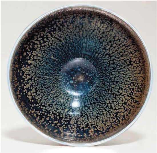 宋代斗茶藝術傳到日本,經過吸收發展的抹茶道,能夠很好地流傳下來。優美而稀少的建盞長期以來是日本上層階級珍藏的寶物,尤其在15世紀達到高潮?!毒_觀左右帳記》記載,曜變是建盞之無上神品,世上罕見之物,值萬匹絹。油滴是第二重寶,五千匹絹,兔毫盞,三千匹絹。當今,優秀的建盞大都被日本收藏。僅存于世的3件曜變都被日本藏為國寶。油滴傳世品也僅10余件,其中一件為日本國寶。我國沒有一件完整的油滴。藏于日本靜嘉堂文庫的曜變被國際陶藝界公認為天下第一名碗并譽為陶瓷藝術的珠峰,但至今無人能復制,這也就可以理解當年為什么會有1500套別墅總和的高價了。