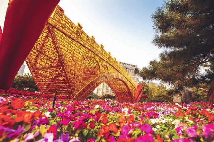 近日,一座橫架在北京東單的金色大橋吸引了來往行人的注意。這座由藝術家舒勇創作的大型景觀雕塑《絲路金橋》全長28米、高6米、寬4米,成為國慶67周年天安門及長安街沿線主題景觀布置中的一個重要組成部分。