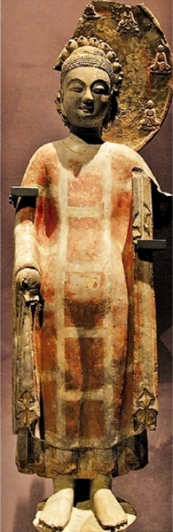 相對前一尊造像而言,青州龍興寺遺址出土北齊佛立像(圖2)則要簡潔得多。這是一尊單體的圓雕佛像,沒有背屏和脅侍菩薩。東魏佛造像是在北魏晚期實例基礎上的繼續發展,那種背屏式造像,其實是對此前石窟造像的模仿。在東魏時期,背屏式造像中的佛像軀體逐漸變得厚實起來。大約在進入北齊后,佛像脫離背屏而變成圓雕佛像。這尊北齊佛立像跣足立于蓮臺山,低肉髻,有細密的螺發,面相豐圓,雙目微睜,嘴角上翹,左手殘缺,右手手指也被破壞,似乎在施與愿印。佛像著通肩式袈裟,袈裟表面畫有紅白相間的粗大田相格。值得注意的是,這尊佛像袈裟表面并沒有雕刻衣紋,只在兩臂下垂衣襟及袈裟下緣表現有簡潔的褶皺,整體特征與印度笈多朝薩爾納特不表現衣紋的“裸體佛像”有諸多相似之處,只是青州實例人體造型明顯單薄、含蓄,這是中國古代匠工受儒家禮教思想的影響所致。另外,頭光中心綻放的蓮花浮雕厚實且圓潤,與外緣的化佛組合在一起,傳達出鮮明的佛教信仰內涵。