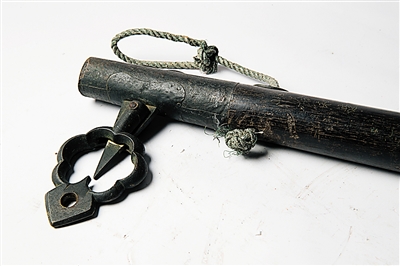 “秤”是市井生活中最常見不過的物品,鬧市中的喧囂與你來我往間的“斤斤計較”讓不少保存至今的秤桿被“生活”磨損得少了美感。而丁英俊在??诒镜厥盏玫倪@桿老秤品相、造型都流露著幾分美意,精致的細節也不難讓人看出當年優良的制造工藝。據介紹,這桿約1米75長的秤桿由鐵力木制成。其前段由銅包裹,在秤的鐵鉤上方,六瓣花狀結構玲瓏有致。當鐵鉤上掛上物品時,在秤砣的配合下,“花”下端的準星會與中間的準星對準,以此實現計量。