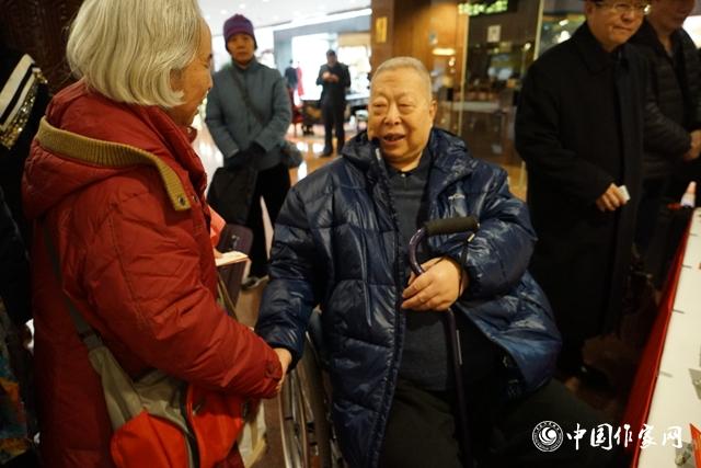 11月29日,中國作協第九次全國代表大會與會代表李希凡和張曉風見面握手交談。