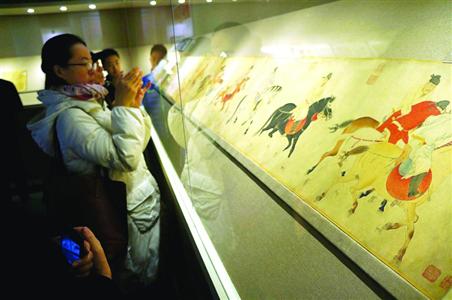 《五王醉歸圖卷》創作于元代,但用的是宋代紙本,長達2.12米,刻畫了唐玄宗五兄弟在一起騎馬游玩的場景。